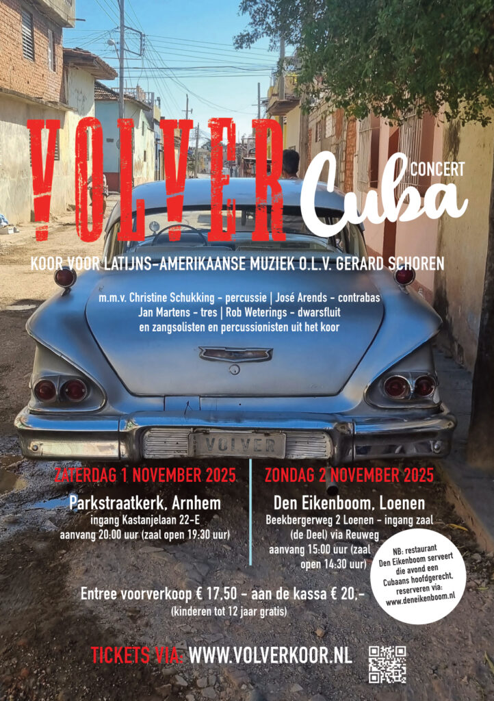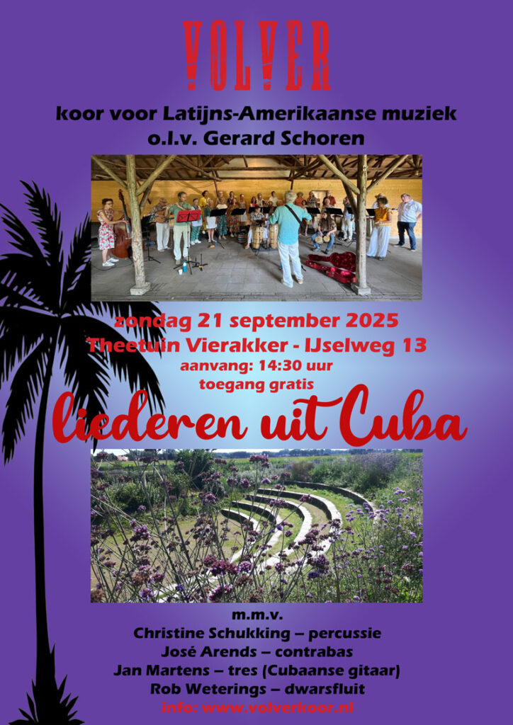 Kom op zaterdag 28 naar Apeldoorn of zondag 29 januari naar Arnhem om te genieten van warmbloedige liederen uit verschillende Latijns-Amerikaanse landen. De kerstliederen maken plaats voor zomerse pareltjes uit het grote repertoire van VOLVER. Het zal hartverwarmend en swingend zijn, dat staat vast. In enkele arrangementen (van de hand van dirigent Gerard Schoren) zullen ook nu weer koorleden solistisch, in kleine subgroepen of als percussionist te horen zijn.